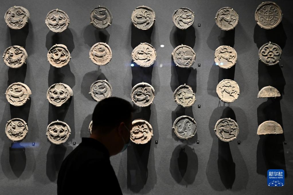 4月28日,游客在陜西考古博物館內參觀寶雞周原遺址出土的銅輪牙馬車車飾。新華社記者 李一博 攝