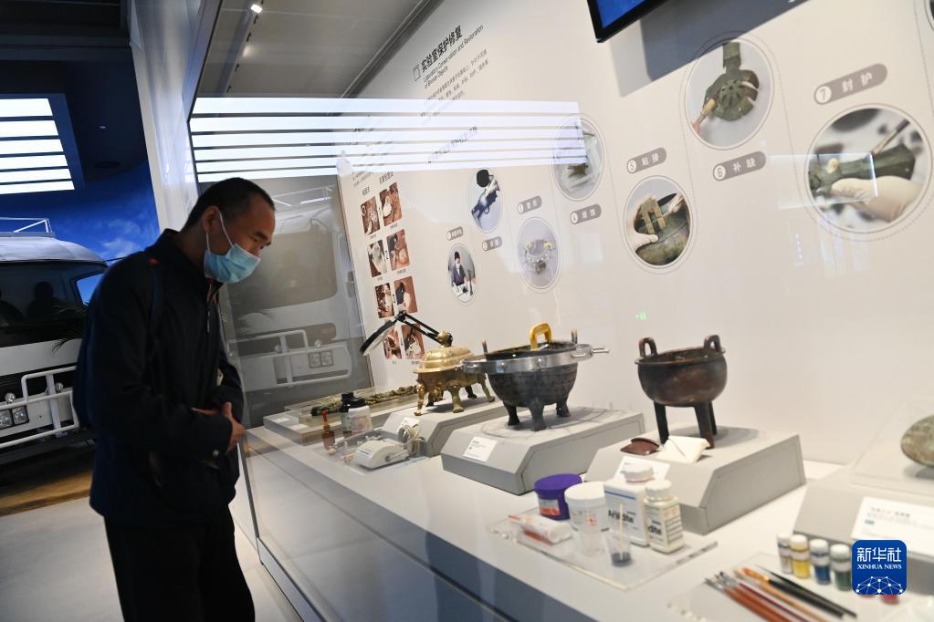 4月28日,游客在陜西考古博物館內參觀考古現(xiàn)場文物保護移動實驗室。新華社記者 李一博 攝