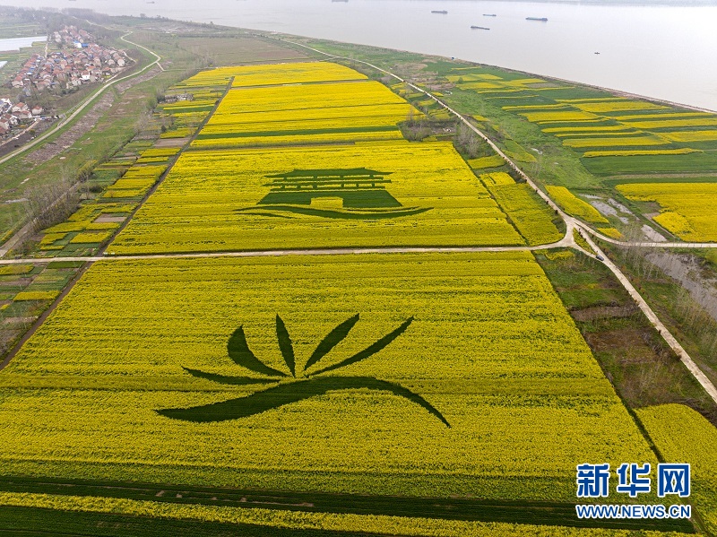 鄂州湖北現(xiàn)代農(nóng)業(yè)科技創(chuàng)新與集成示范基地。從空中俯瞰,大片大片金黃的油菜花田里,鑲嵌著由一片綠色植物組成的圖案,綠黃分明,映襯出“鄂州基地”“中國飯碗”幾個(gè)大字。
