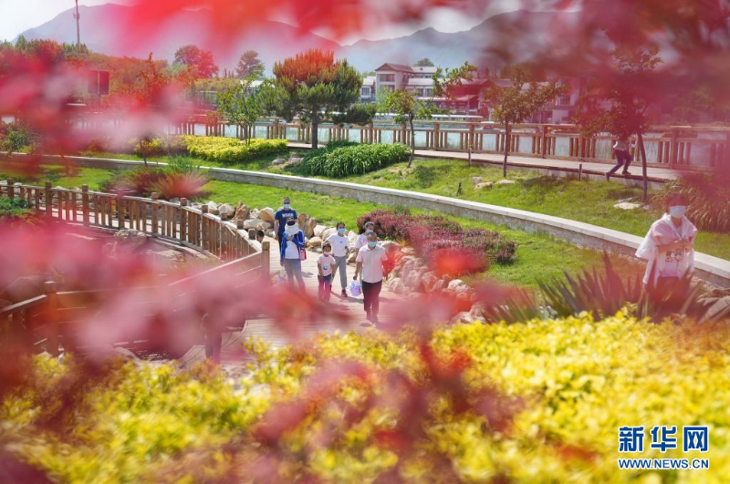 5月3日,游客在河北省石家莊市龍泉湖濕地公園內(nèi)游覽。新華社記者 牟宇 攝