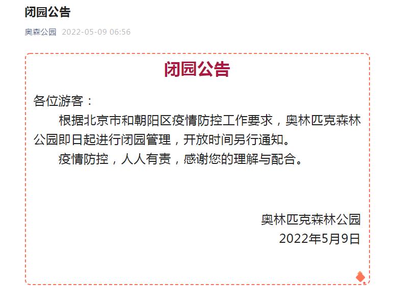 “奧森公園”微信公眾號(hào)9日發(fā)布閉園公告,根據(jù)北京市和朝陽(yáng)區(qū)疫情防控工作要求,奧林匹克森林公園即日起進(jìn)行閉園管理,開(kāi)放時(shí)間另行通知。