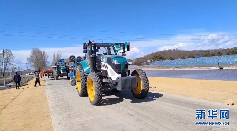 北大荒集團建三江分公司八五九農(nóng)場有限公司數(shù)十臺大馬力巨無霸農(nóng)機在田間播種大豆。新華網(wǎng)發(fā)(李明達 攝)