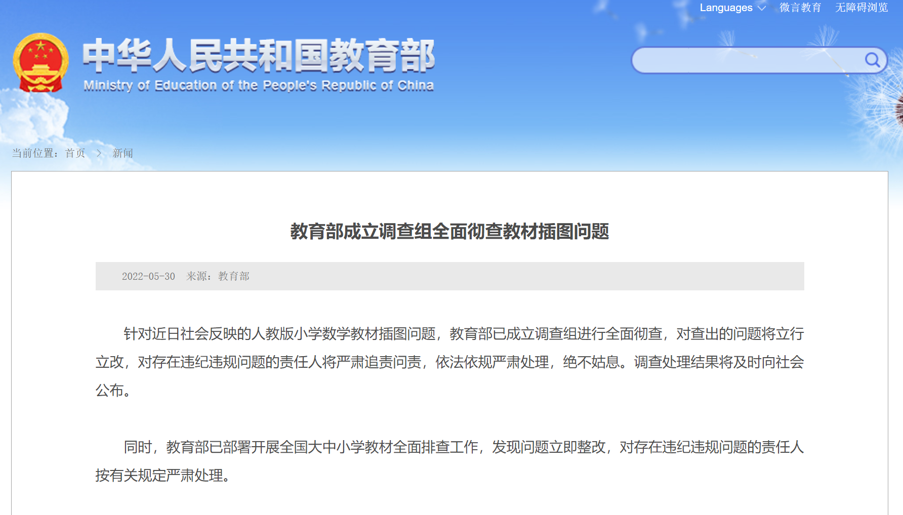 針對近日社會(huì)反映的人教版小學(xué)數(shù)學(xué)教材插圖問題,教育部已成立調(diào)查組進(jìn)行全面徹查,對查出的問題將立行立改,對存在違紀(jì)違規(guī)問題的責(zé)任人將嚴(yán)肅追責(zé)問責(zé),依法依規(guī)嚴(yán)肅處理,絕不姑息。調(diào)查處理結(jié)果將及時(shí)向社會(huì)公布。