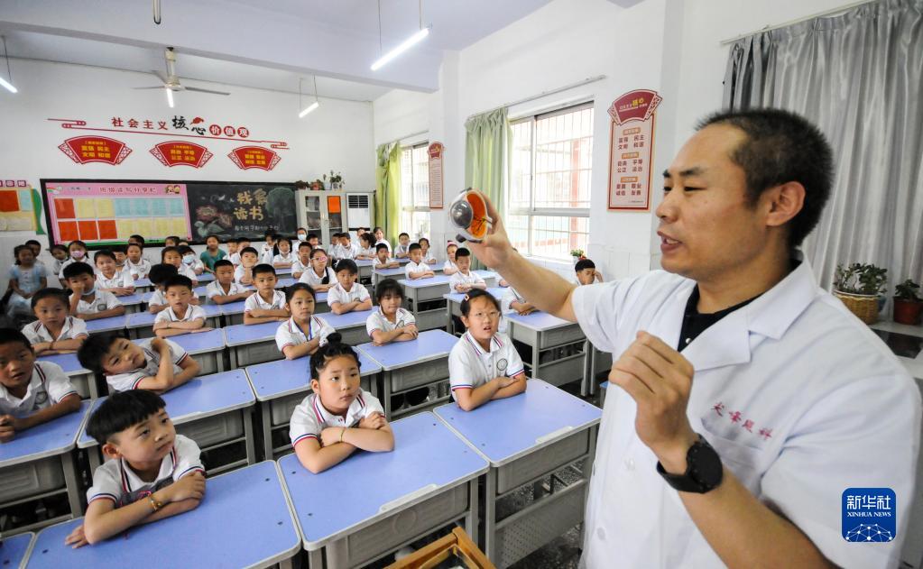 6月5日,在重慶市北碚區(qū)一家眼科醫(yī)院,一名驗(yàn)光師在給孩子們講解眼球構(gòu)造知識。新華社發(fā)(秦廷富 攝)