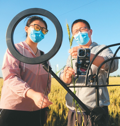 在山東省聊城市東昌府區(qū)閆寺街道周店村小麥良種繁育展示基地,負責技術的當?shù)厍嗄暝趯π←溒贩N進行直播推介。 |