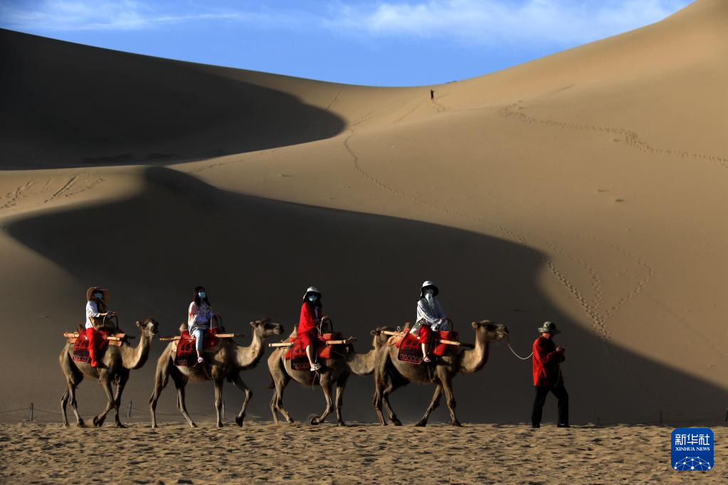 6月19日,游客在甘肅省敦煌市鳴沙山月牙泉景區(qū)騎駱駝?dòng)斡[。新華社發(fā)(張曉亮 攝)