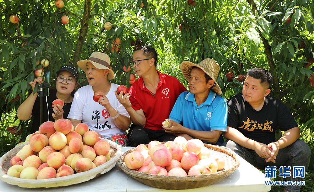 圖為黃岡市浠水縣“網(wǎng)紅”主播幫果農(nóng)直播銷(xiāo)售水蜜桃。新華網(wǎng)發(fā)