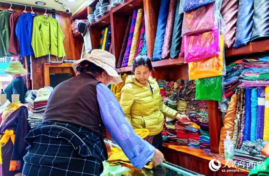 顧客正在卓瑪?shù)牟匮b店挑選服裝。人民網 李海霞攝