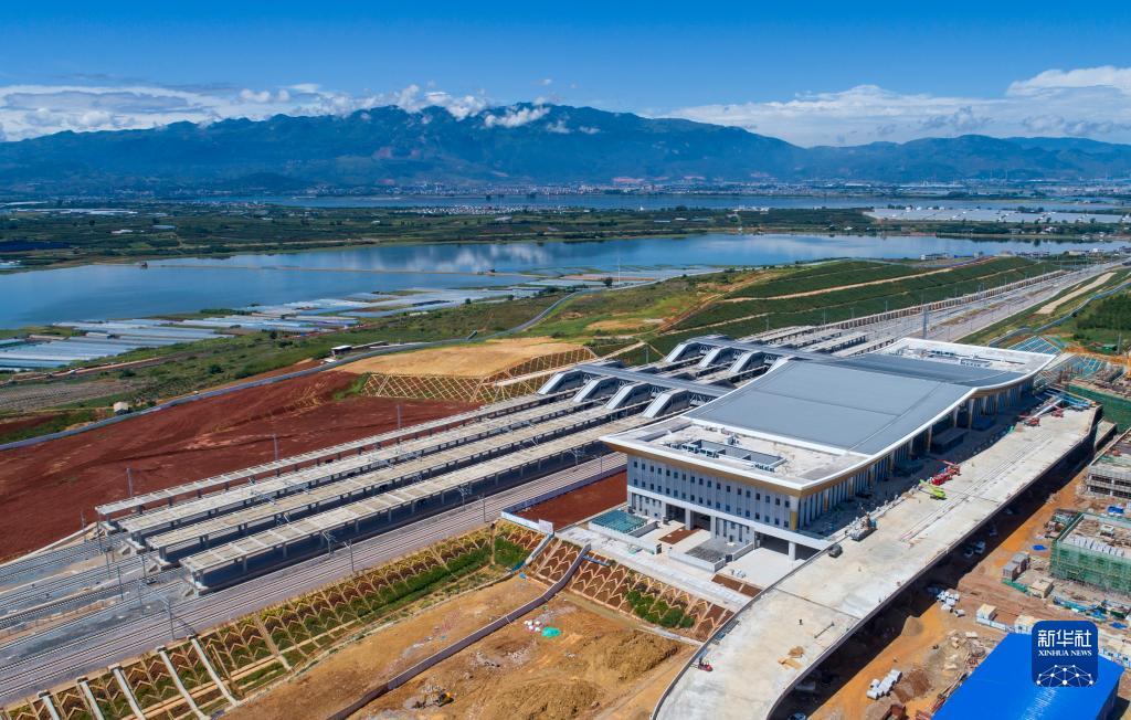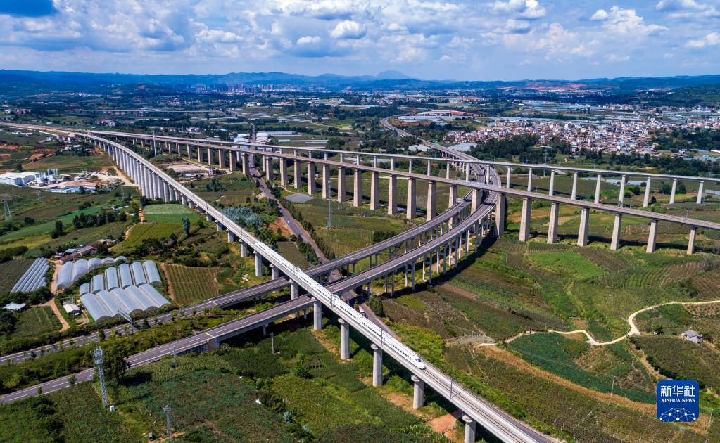 8月23日,綜合檢測(cè)車(chē)在彌蒙高鐵彌勒站附近上行線行駛,遠(yuǎn)處是下行線,中間橫向鐵路是南寧至昆明客運(yùn)專線,下穿高速是瀘彌高速(無(wú)人機(jī)照片)。新華社記者 陳欣波 攝