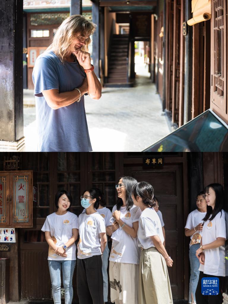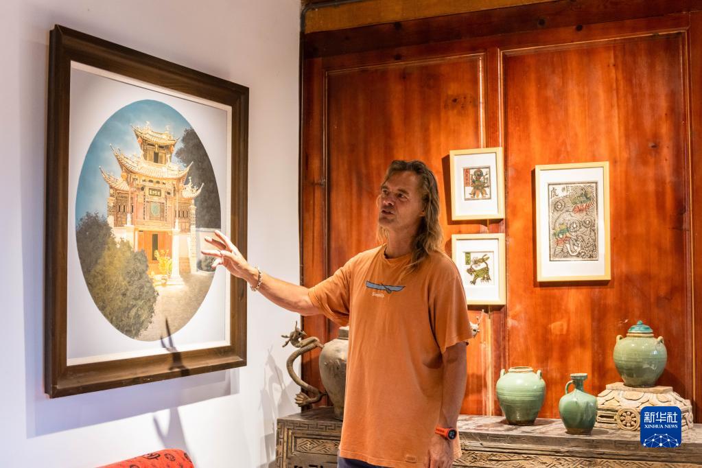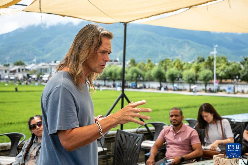 8月27日,林登在喜洲古鎮(zhèn)喜林苑向外國訪客介紹當(dāng)?shù)匚幕?。新華社記者 曹夢瑤 攝