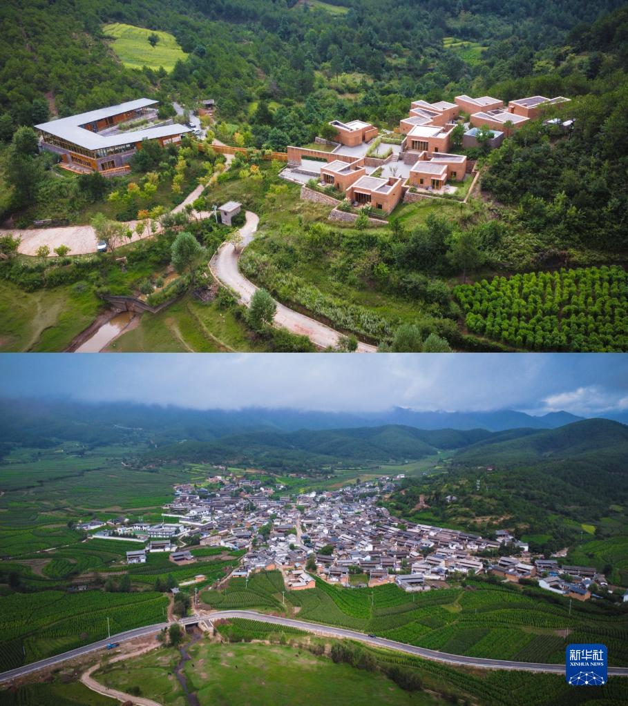 拼版照片:上圖為位于云南省沙溪鎮(zhèn)石龍村的喜林苑沙溪店(8月31日攝,無人機(jī)照片);下圖為喜林苑沙溪店所在的石龍村(8月31日攝,無人機(jī)照片)。新華社記者 曹夢瑤 攝