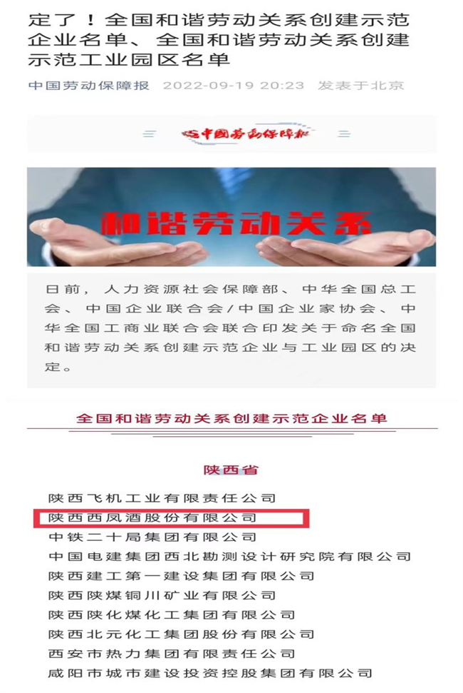 西部決策網(wǎng)訊(記者艾米杰 韓宗憲 通訊員 許凡 張?zhí)炝ⅲ闃淞⑹痉兜湫?、弘揚人文關(guān)懷、傳遞和諧溫暖,進一步推動廣大企業(yè)深入開展和諧勞動關(guān)系創(chuàng)建活動,促進構(gòu)建中國特色和諧勞動關(guān)系。近日,人力資源和社會保障部、中華全國總工會、中國企業(yè)聯(lián)合會/中國企業(yè)家協(xié)會、中華全國工商業(yè)聯(lián)合會聯(lián)合印發(fā)《關(guān)于命名全國和諧勞動關(guān)系創(chuàng)建示范企業(yè)與工業(yè)園區(qū)的決定》,陜西西鳳酒股份有限公司榜上有名,榮獲“全國和諧勞動關(guān)系創(chuàng)建示范企業(yè)”稱號。