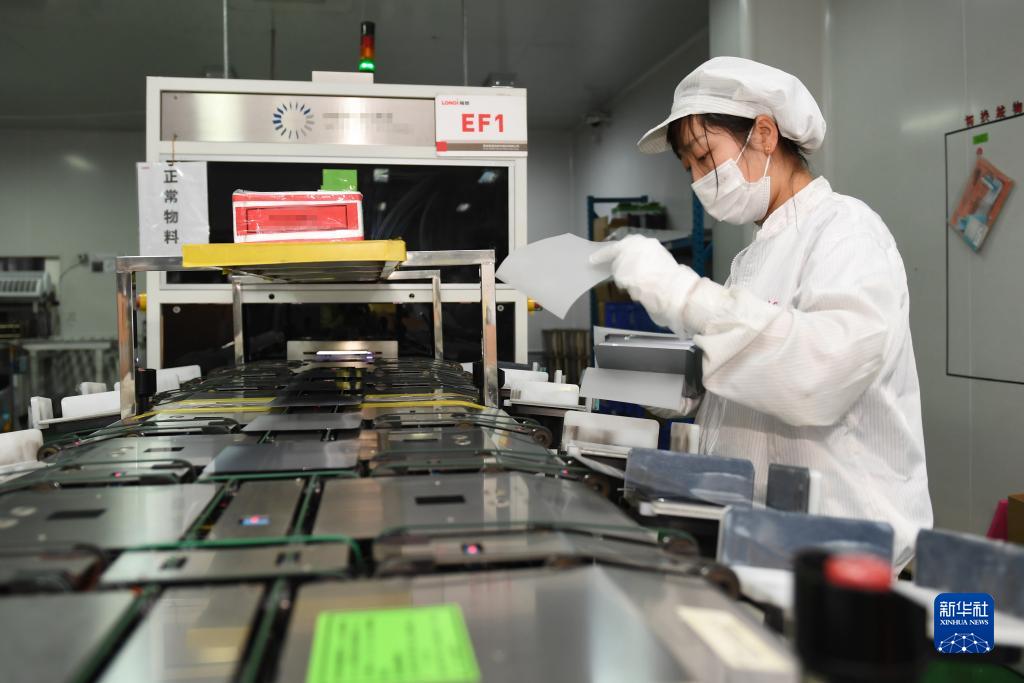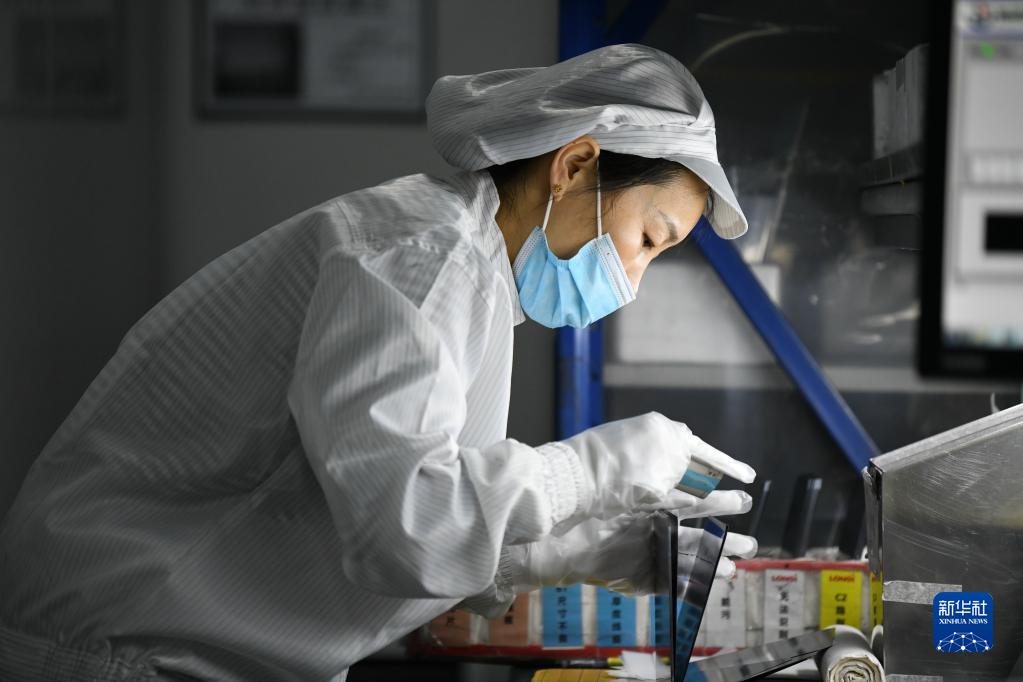 在隆基綠能科技股份有限公司西安切片工廠,工人在進(jìn)行檢測(cè)包裝作業(yè)(2022年1月18日攝)。新華社記者 李一博 攝