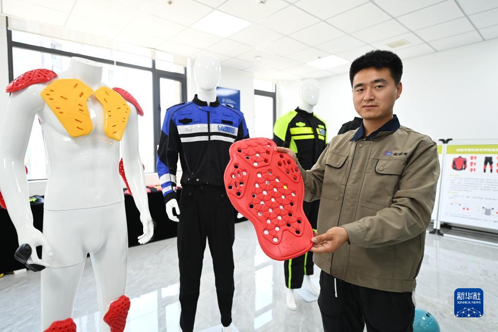 在位于秦創(chuàng)原總窗口所在地陜西省西咸新區(qū)的陜西拓銳考新材料科技有限公司,工作人員展示自主研發(fā)的納米智能吸能慢回彈護(hù)具(2022年6月17日攝)。新華社記者 李一博 攝