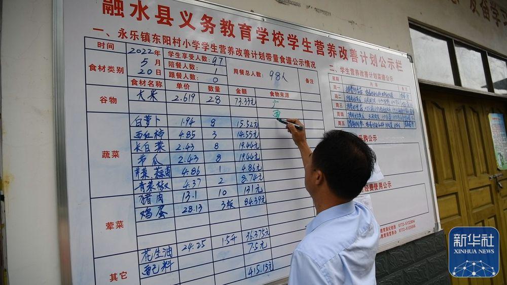 5月20日,在廣西融水苗族自治縣東陽村小學(xué)食堂,校長藍(lán)正立在告示牌上寫菜譜。新華社記者 張愛林 攝