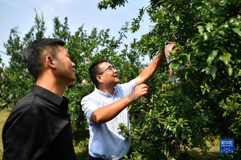 陜西省西安市臨潼區(qū)園藝工作站工作人員(右)與當地石榴種植大戶交流果品長勢(2022年9月26日攝)。新華社記者 張博文 攝