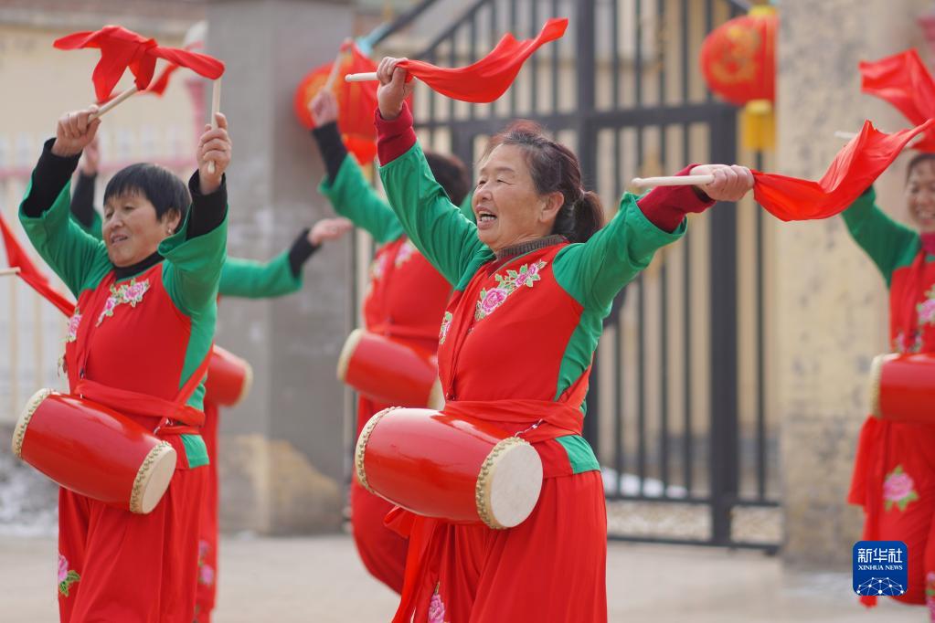 河北省邢臺市內丘縣史村屯村村民在廣場排練腰鼓(2022年1月29日攝)。新華社發(fā)(劉繼東 攝)