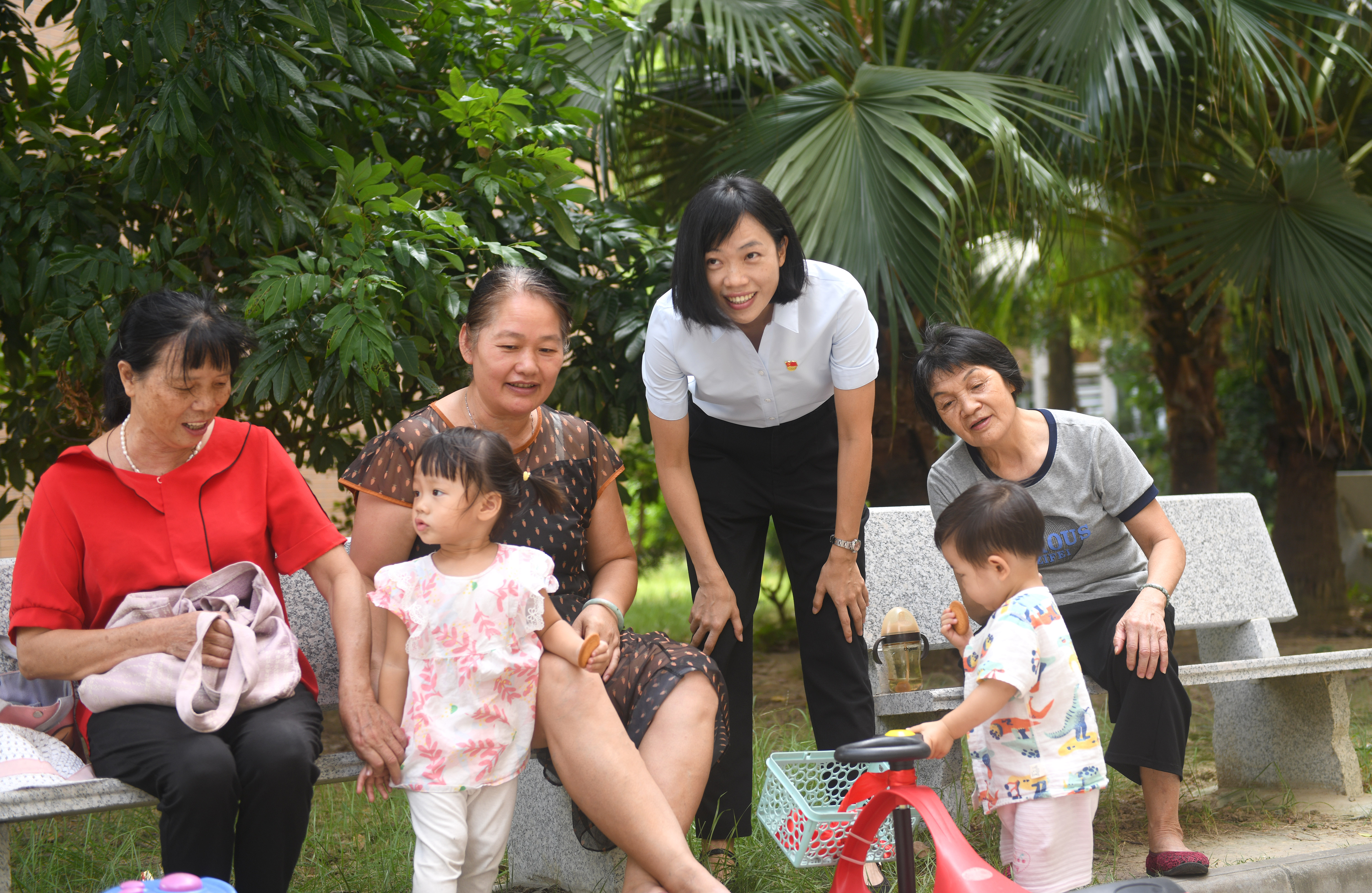 二十大代表、廣東省佛山市禪城區(qū)古灶村黨委書記、村委會主任陸秀興(右三)和村民在一起聊天(2022年9月7日攝)。新華社記者 盧漢欣 攝