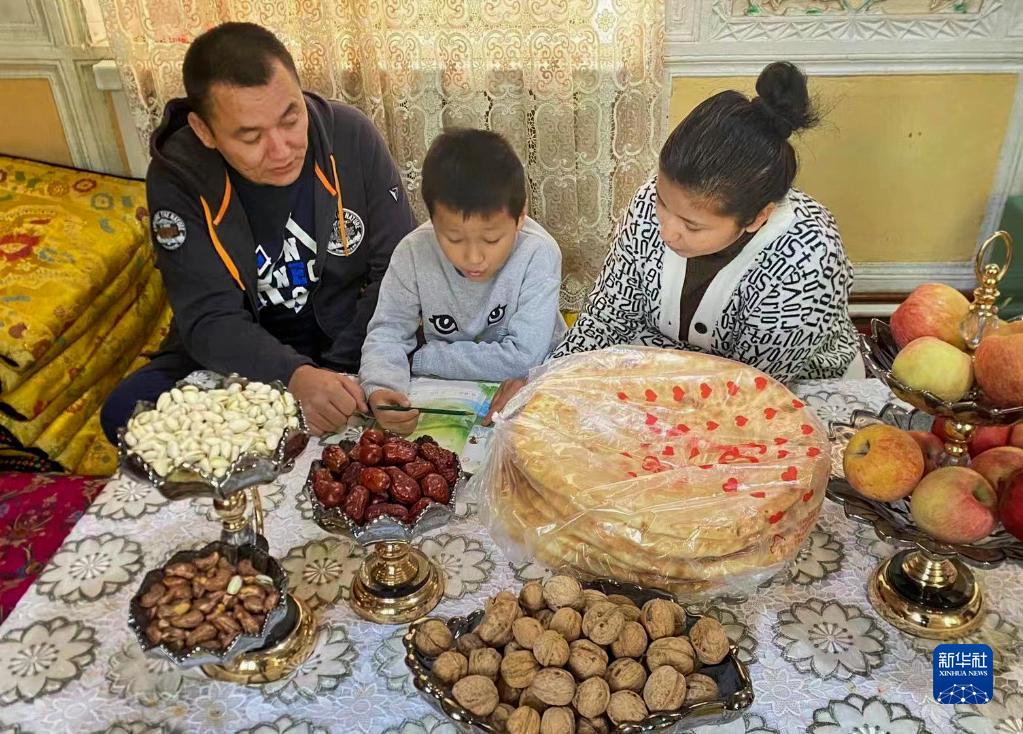 10月16日,新疆喀什古城居民阿依先木姑力·阿布來提(右)在家中輔導(dǎo)孩子功課。新華社發(fā)(唐努爾·玉麥爾 攝)