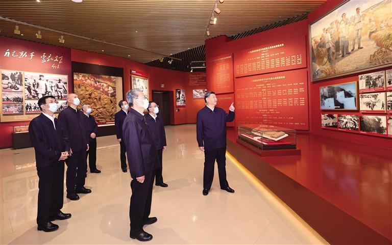 10月27日,中共中央總書(shū)記、國(guó)家主席、中央軍委主席習(xí)近平帶領(lǐng)中共中央政治局常委李強(qiáng)、趙樂(lè)際、王滬寧、蔡奇、丁薛祥、李希,瞻仰延安革命紀(jì)念地。這是習(xí)近平等在延安革命紀(jì)念館,參觀《偉大歷程——中共中央在延安十三年歷史陳列》。 新華社記者 鞠鵬攝