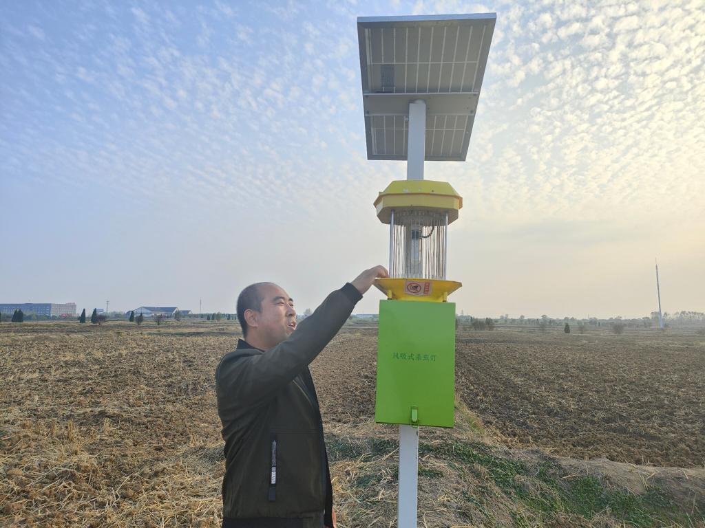 閆大明正在介紹風(fēng)吸式殺蟲燈。新華社記者 姜剛 攝