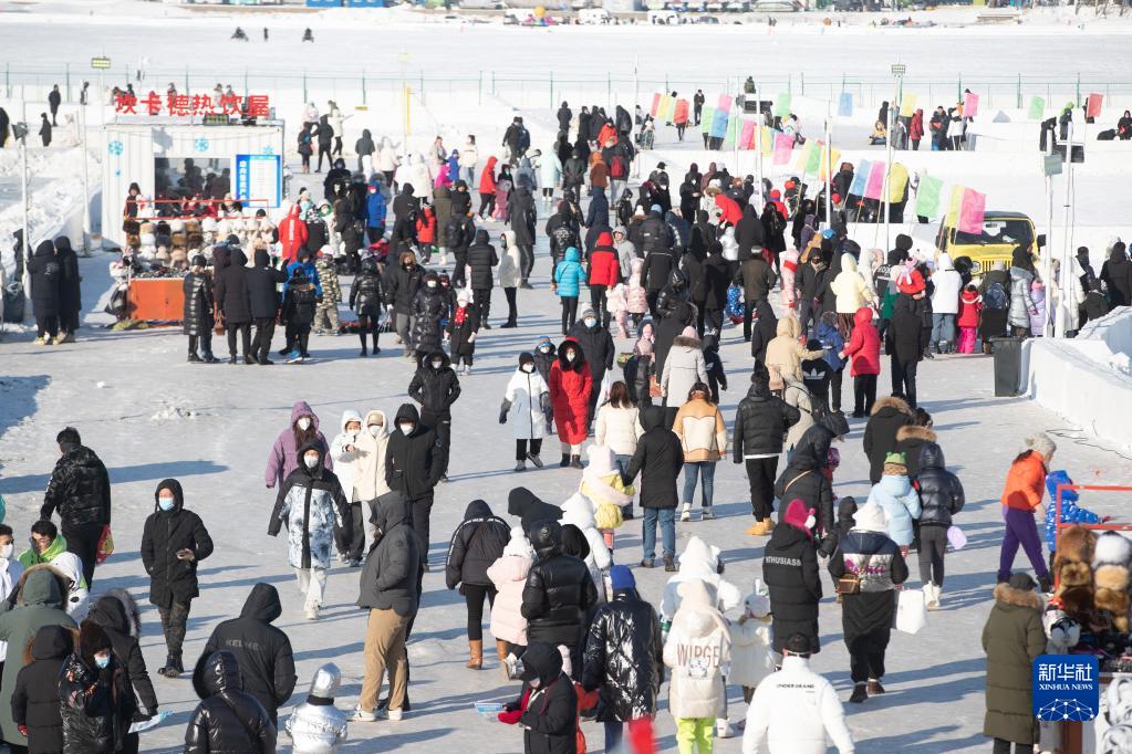 1月1日,游客在哈爾濱松花江冰雪嘉年華園區(qū)游玩。新華社記者 張濤 攝