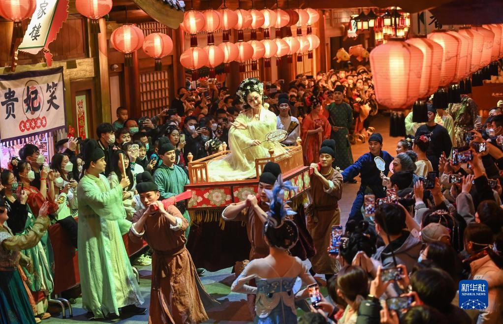 2022年12月31日,游客在陜西西安長安十二時辰主題街區(qū)觀看表演。新華社發(fā)(鄒競一 攝)