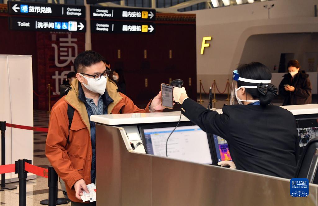 1月17日,在北京大興機(jī)場(chǎng),海關(guān)關(guān)員核驗(yàn)乘坐CZ309次北京飛往香港航班旅客的海關(guān)健康申報(bào)二維碼。新華社記者 任超 攝