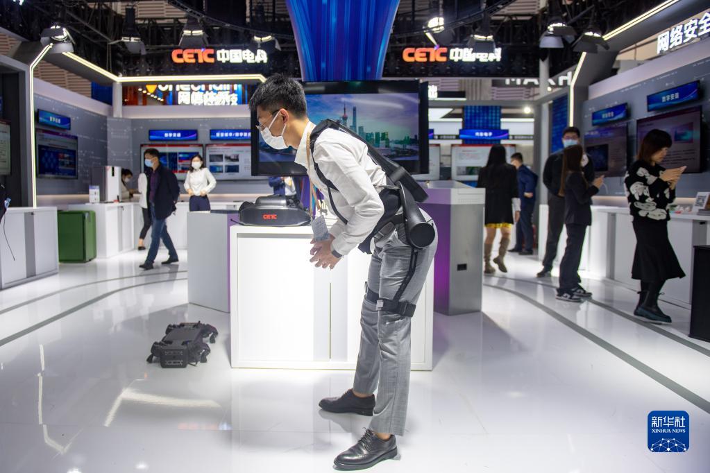 在浙江烏鎮(zhèn)舉辦的2022年“互聯(lián)網(wǎng)之光”博覽會(huì)上,中國(guó)電科工作人員為觀眾演示外骨骼機(jī)器人的使用(2022年11月8日攝)。新華社記者 江漢 攝