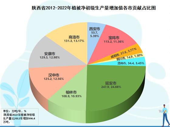 2012-2022年分市元生產(chǎn)量增長貢獻(xiàn)分析結(jié)果表明,各市對(duì)全省生態(tài)蛋糕增長均有所貢獻(xiàn),但各市的貢獻(xiàn)大小差異很大,在生態(tài)蛋糕中的地位也隨之有所變化。全國退耕還林策源地美稱的延安是全省生態(tài)蛋糕增量最大的市,10年增加247.9萬噸,為全省生態(tài)蛋糕增加量貢獻(xiàn)了24.9個(gè)百分點(diǎn)。商洛第二,10年增加131.3萬噸,為全省貢獻(xiàn)13.2個(gè)百分點(diǎn)。安康第三,10年增加129.3萬噸,為全省貢獻(xiàn)13.0個(gè)百分點(diǎn)。漢中第四,增加125.2萬噸,為全省貢獻(xiàn)12.6個(gè)百分點(diǎn)。其后,依次分別是寶雞增加113.2萬噸、為全省貢獻(xiàn)11.4%,榆林增加108.9萬噸、為全省貢獻(xiàn)10.9%,西安增加53.7萬噸、為全省貢獻(xiàn)5.4%,咸陽增加37.6萬噸、為全省貢獻(xiàn)3.8%,渭南增加34.4萬噸、為全省貢獻(xiàn)3.4%,銅川增加24.9萬噸、為全省貢獻(xiàn)1.5%。