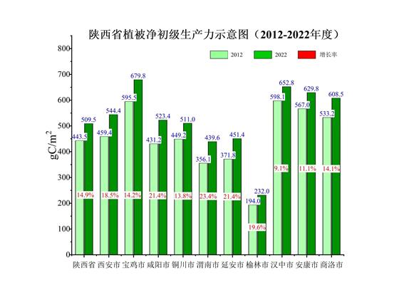 2012-2022年分市元生產(chǎn)力增長率分析結(jié)果表明,新時(shí)代10年,全省各市生態(tài)蛋糕越做越大,元生產(chǎn)力均有不同程度增長。有關(guān)中東大門之稱的渭南是全省元生產(chǎn)力增長最快的市,增長率為23.4%,從2012年237.4公斤/畝,增加到2022年的293.1公斤/畝,增加55.7公斤/畝;咸陽、延安增長率均為21.4%,并列全省第二,分別由2012年的287.5公斤/畝、247.9公斤/畝,增加到2022年的349.0公斤/畝、300.9公斤/畝,分別增加61.5公斤/畝、53公斤/畝。榆林居第四,增長19.6%。其后,依次分別西安增長18.5%,寶雞14.2%,商洛14.1%,銅川13.8%,安康11.1%,漢中9.1%。