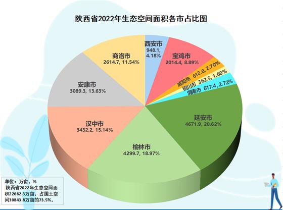 陜西南部秦巴山脈、北部黃土高原、中部渭河川地,自然生態(tài)空間多、占比大。陜西省生態(tài)空間數(shù)據(jù)中心提供的數(shù)據(jù)顯示,全省國土空間3.08億畝,其中生態(tài)空間(林地、草地、濕地、荒野)2.26億畝。從全省10市生態(tài)空間大格局分析觀察,黃土高原腹地的延安是全省生態(tài)空間第一市,生態(tài)空間4671.9萬畝、占本市國土空間84.1%、占全省生態(tài)空間20.6%。長城內(nèi)外、林草過度的榆林居第二,生態(tài)空間4299.7萬畝、占本市國土空間66.8%、占全省生態(tài)空間19.0%。第三是漢中,生態(tài)空間3432.2萬畝、占本市國土空間84.4%、占全省生態(tài)空間15.1%。第四是安康,生態(tài)空間3089.3萬畝、占本市國土空間87.5%、占全省生態(tài)空間13.6%。其后,依次分別是商洛,生態(tài)空間2614.7萬畝、占本市國土空間90.0%、占全省生態(tài)空間11.5%,寶雞2014.4萬畝、占本市74.1%、占全省8.9%,西安948.1萬畝、占本市62.6%、占全省4.2%,渭南617.4萬畝、占本市31.5%、占全省2.7%,咸陽612萬畝、占本市39.5%、占全省2.7%,銅川362.5萬畝、占本市62.2%、占全省1.6%。