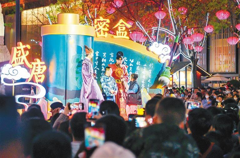文化為旅游賦能,旅游因文化而有了靈魂。如果說大唐不夜城是西安盛唐文化的名片,那么大唐不夜城的演出則把盛唐文化真切地呈現(xiàn)在了人們的面前?!赌奚延鹨挛琛肥鞘⑻谱钊A麗的舞蹈,《花車斗彩》展示了大唐風(fēng)采,《盛唐密盒》把生活過成了段子,《華燈太白》凝結(jié)了李白的詩情與不羈,“不倒翁小姐姐”巧笑倩兮,搖出了長安女子的溫柔……