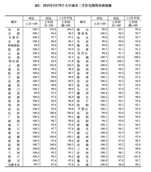 2023年3月70個大中城市二手住宅銷售價格指數(shù)。 截圖自國家統(tǒng)計局官網(wǎng)