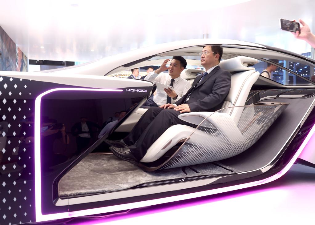 4月18日,觀眾在上海車展一汽展臺體驗智能座艙。新華社記者陳建力 攝