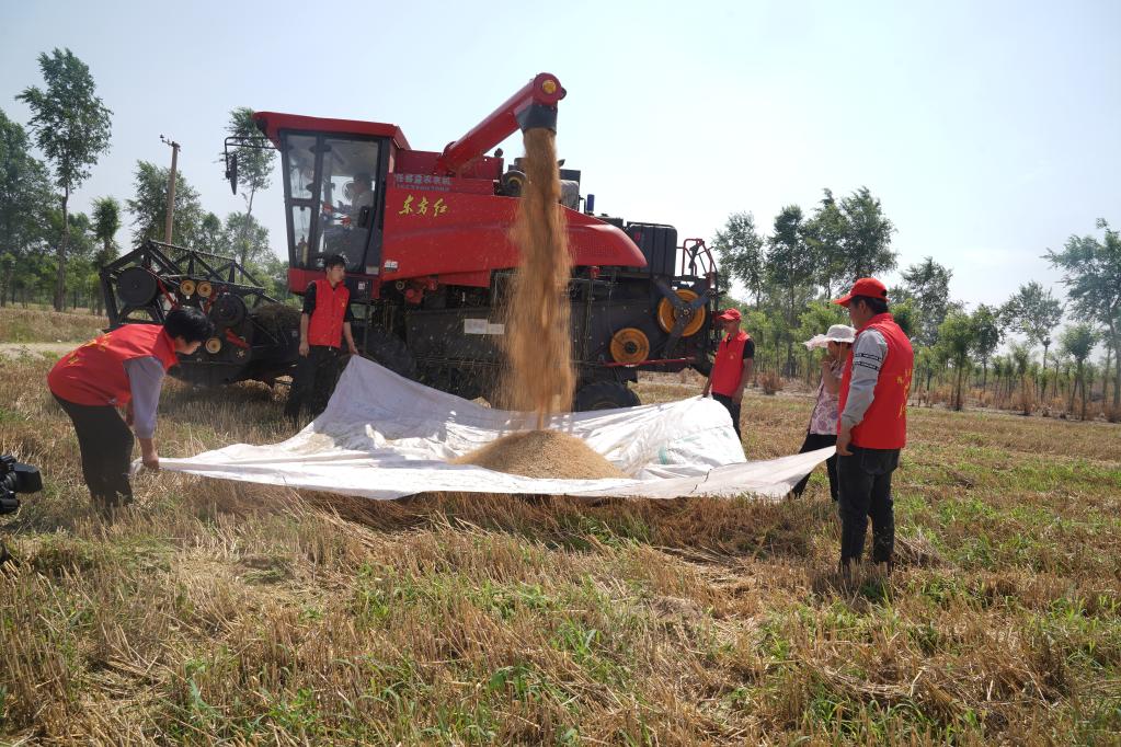在河北邢臺經濟開發(fā)區(qū)的一處麥田,志愿者正在幫助農民收小麥。新華社記者 鄒尚伯 攝