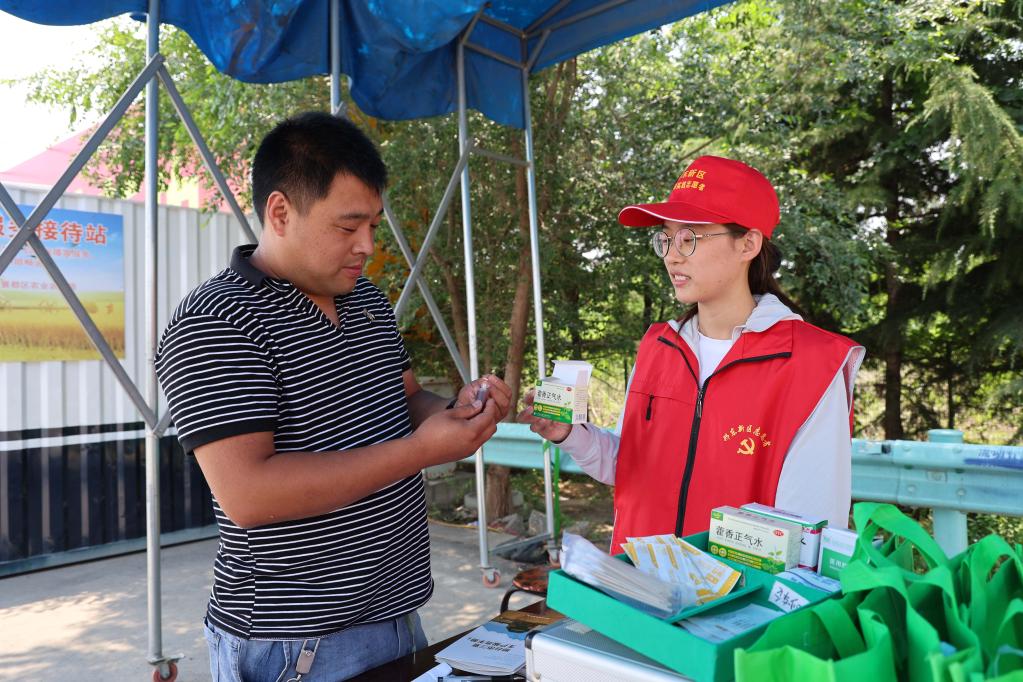 在G4京港澳高速邢臺北口,跨區(qū)機收接待服務站工作人員向農機手發(fā)放防暑物品。新華社記者 鄒尚伯 攝