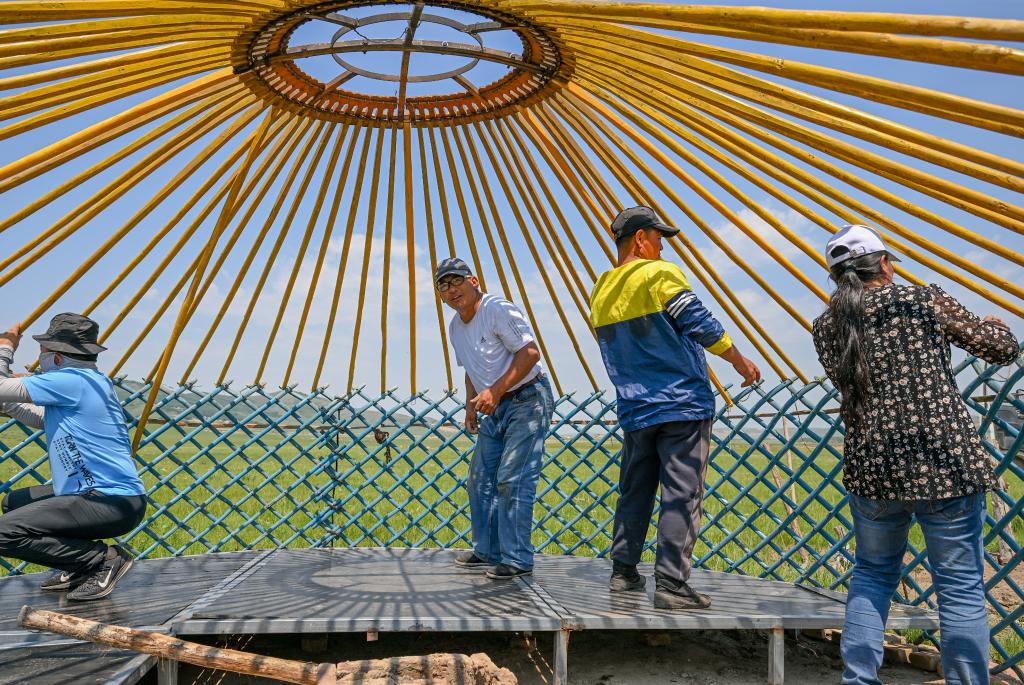 額爾敦巴特爾一家在周圍牧民的幫助下搭建氈房。新華社記者連振 攝