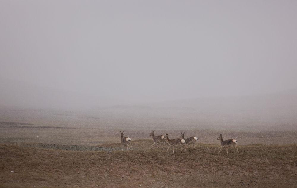 6月16日,在長(zhǎng)江源地區(qū)的楚瑪爾河附近,幾只藏原羚在嬉戲。