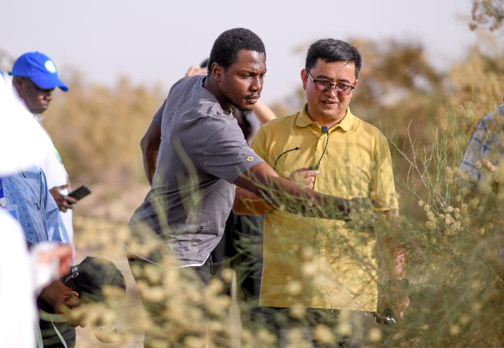 2023年6月13日,在中科院新疆生態(tài)與地理研究所策勒沙漠研究站天然實(shí)驗(yàn)區(qū),中國科研人員買爾當(dāng)(右一)為參加第二屆非洲綠色長城建設(shè)技術(shù)培訓(xùn)班的學(xué)員講解。新華社記者 王菲 攝
