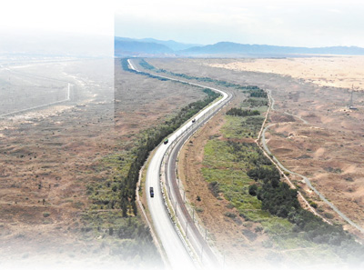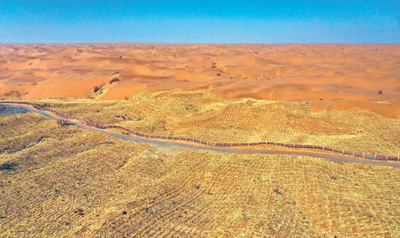 治沙防護(hù)體系守護(hù)包蘭鐵路平穩(wěn)運行。 |