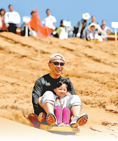 沙坡頭旅游景區(qū),游客在體驗滑沙項目。 |