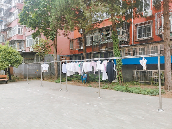 走出古城南路社區(qū)東門,沿古城東街北行400余米右轉(zhuǎn)進入八角北路社區(qū),只見幾株高大的國槐及道邊的綠藤錯落有致。再向里走,是一塊寬闊的活動場地,北側(cè)建有一排不銹鋼晾衣架,架上晾滿了衣服。“有居民提出家里陽臺上晾衣服不方便,我們特地尋找合適地方,為這些社區(qū)建了晾衣架。”北京石房物業(yè)有限公司(以下簡稱石房物業(yè))副經(jīng)理孫偉說。
