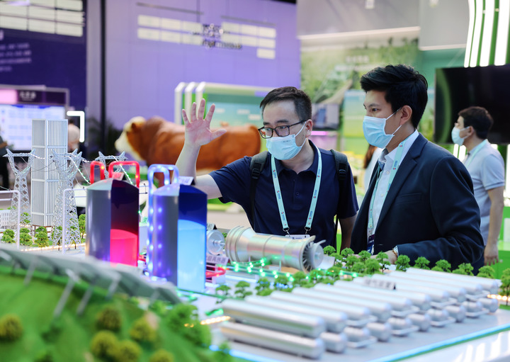 5月26日,觀眾在在中關(guān)村國家自主創(chuàng)新示范區(qū)展示中心了解100MW先進(jìn)壓縮空氣儲(chǔ)能技術(shù)。新華社記者 張晨霖 攝