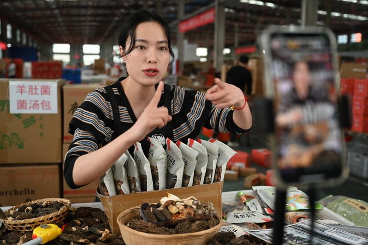 福建省寧德市近年來加大電商人才培育,推動鄉(xiāng)村振興和經濟高質量發(fā)展。圖為不久前的一處農產品深精加工車間內,當?shù)匾幻娚讨鞑フ诮榻B羊肚菌產品。新華社記者 林善傳攝