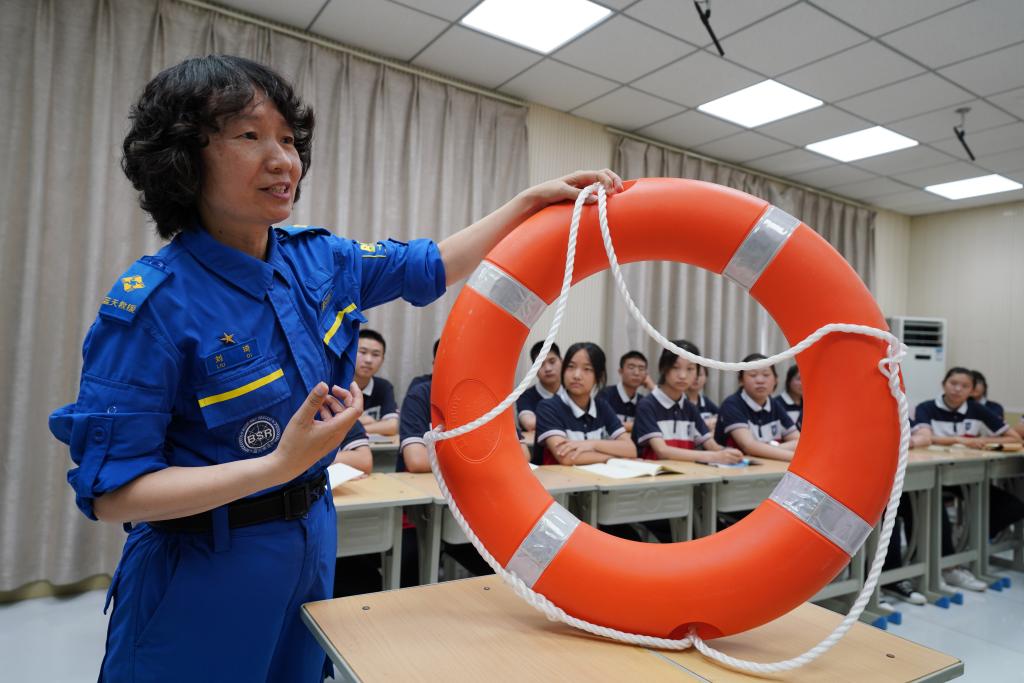 河北邢臺藍(lán)天救援隊(duì)志愿者指導(dǎo)邢臺市第八中學(xué)學(xué)生使用救生圈。 新華社記者駱學(xué)峰 攝