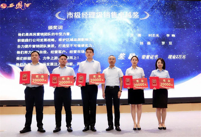 西鳳股份公司總經(jīng)理助理趙永紅為市級(jí)經(jīng)理銷售卓越獎(jiǎng)獲得者頒發(fā)榮譽(yù)證書與獎(jiǎng)金