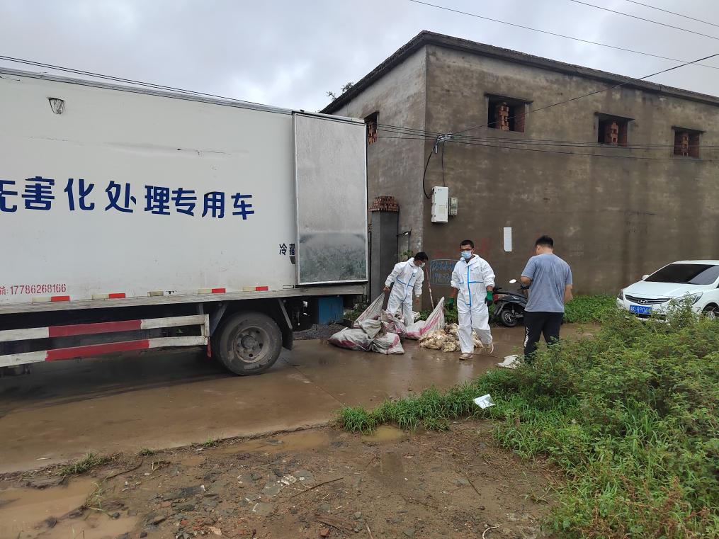 在邯鄲市雞澤縣雙塔鎮(zhèn)中申底村一家蛋雞養(yǎng)殖場(chǎng)內(nèi),縣農(nóng)業(yè)農(nóng)村局動(dòng)物衛(wèi)生監(jiān)督所負(fù)責(zé)人高仁鵬帶領(lǐng)消毒技術(shù)指導(dǎo)組成員對(duì)養(yǎng)殖場(chǎng)內(nèi)淹死的410只蛋雞進(jìn)行集中收集,通過(guò)專業(yè)車輛運(yùn)往病死畜禽無(wú)害化處理廠進(jìn)行專業(yè)處理。