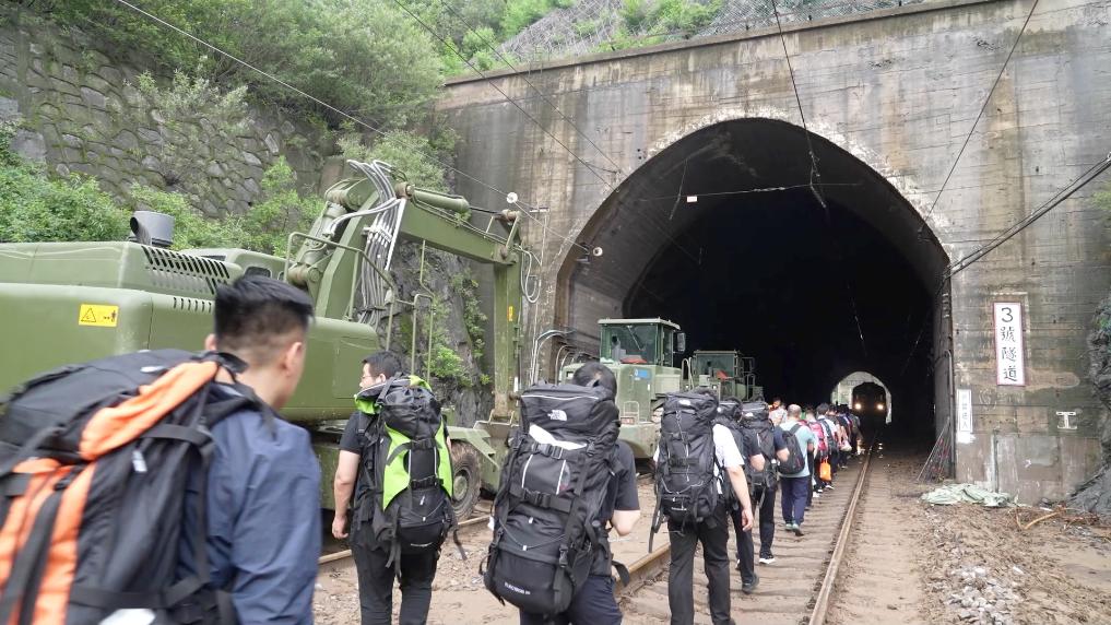 隨后,突擊隊(duì)成員徒步攜帶生活物資向安家莊站、落坡嶺站行進(jìn)。身負(fù)30至40斤背包,沿著受損的鐵路線,徒步11余公里,穿越7個隧道,為安家莊站、落坡嶺站滯留旅客及時送去物資。