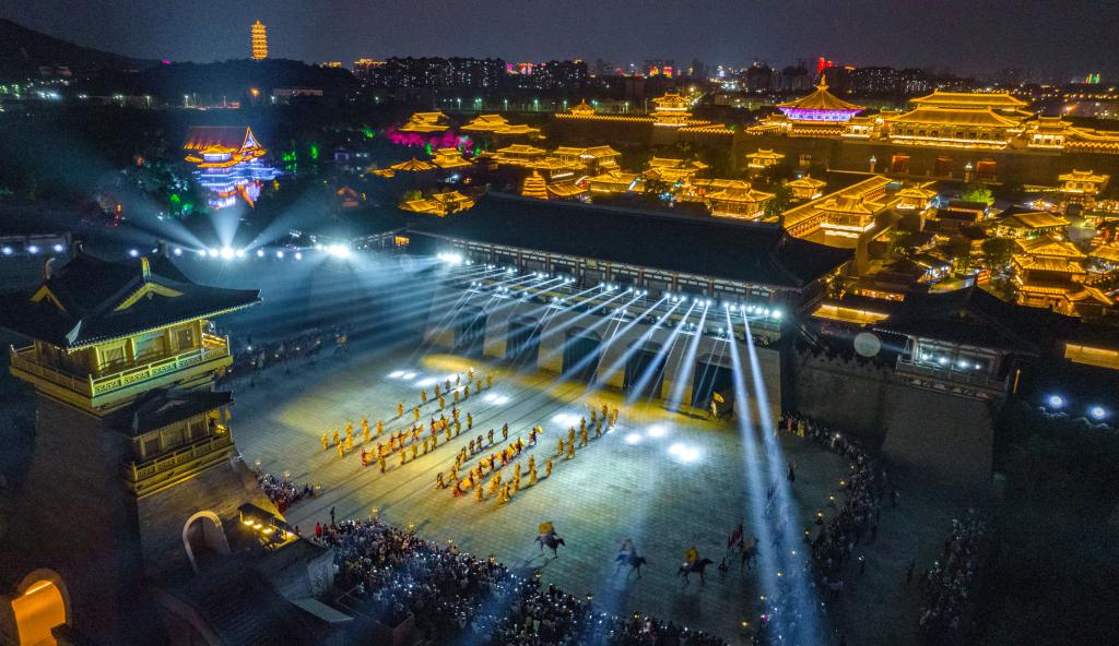 夜幕降臨,湖北襄陽盛世唐城景區(qū)燈光閃爍、樂聲怡人,游客沉浸式體驗夜游項目《盛世唐城之大唐倚夢2》。沿著參觀路線,游客可觀賞不同的劇目表演,體驗盛唐情景。近年來,國家歷史文化名城襄陽注重發(fā)掘人文元素,激發(fā)文旅產(chǎn)業(yè)活力,推動當?shù)貜穆糜芜^境地向旅游目的地轉變。